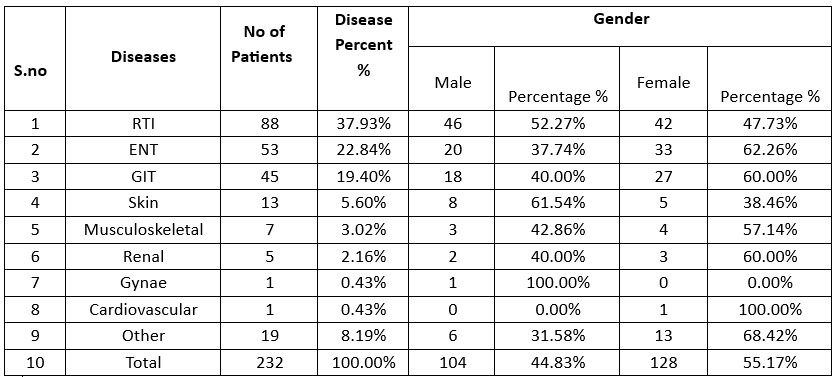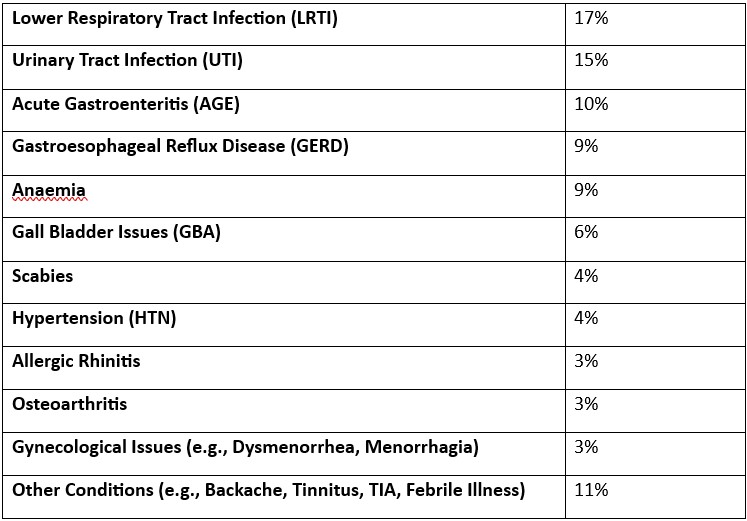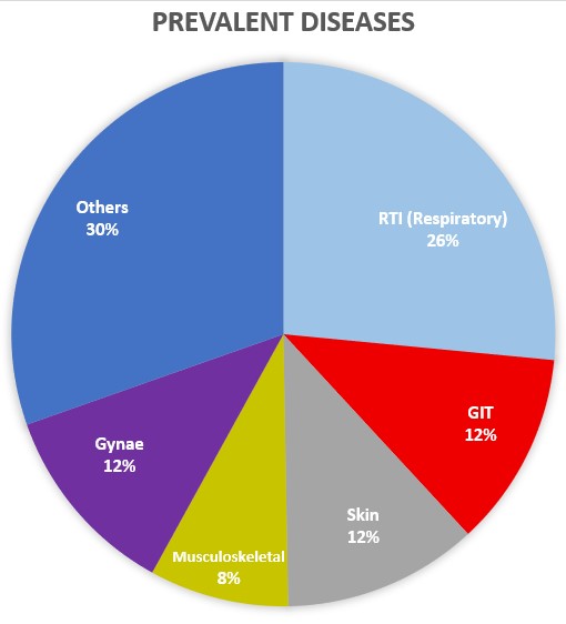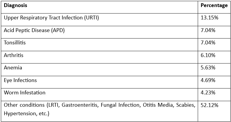 The most frequently reported illnesses included, Gastroenteritis, Upper Respiratory Tract Infections (URTI), Scabies, Urinary Tract Infections (UTI), Anemia, Arthritis, Diarrhea, Asthma, Hypertension, Pharyngitis, Vertigo, Otitis Media, and Worm Infestation were also noted among patients.