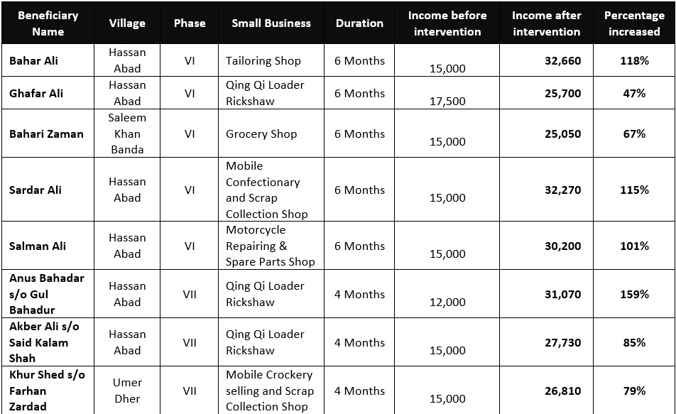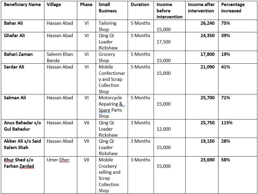 On 17th July 2025, the M&E team conducted an outcome assessment of SREP Phase VI beneficiaries in the villages of Waryani, Jhangi Khan, and Hashim. During the visit, the team met with all beneficiaries, reviewed their progress, and physically checked the present stocks maintained under SREP. The assessment included discussions on business growth, challenges faced, and overall management of the supported enterprises. Preliminary findings indicated a positive trend in stock maintenance and income generation, reflecting improved business practices and better financial outcomes for the supported beneficiaries.