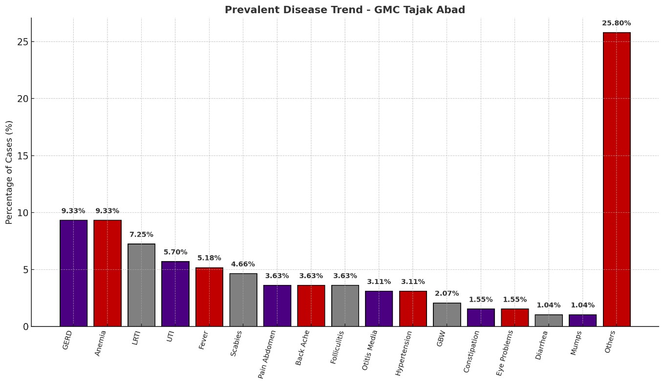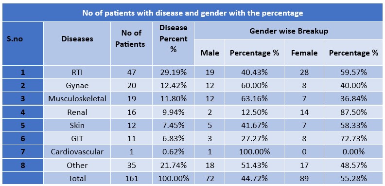 Common illnesses treated during the camp included respiratory tract infections, gastrointestinal issues, skin diseases, musculoskeletal pain, gynecological cases, and others such as anemia and ear infections. A detailed disease trend showed that respiratory illnesses were the most common, followed by general weakness and miscellaneous conditions.